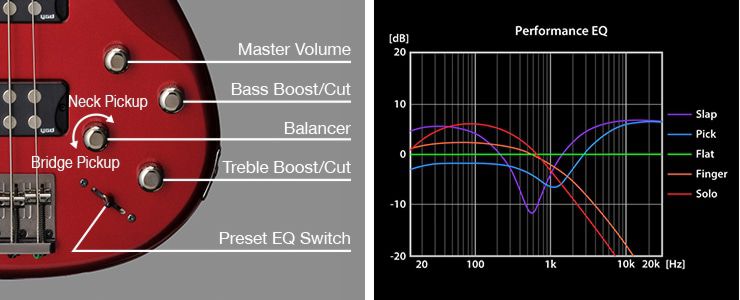 Серия бас гитар YAMAHA TRBX300 включает регуляторы громкости (мастер), баланса и активный двухполосный эквалайзер с переключателем предустановки Performance EQ для мощного и точного формирования тона.