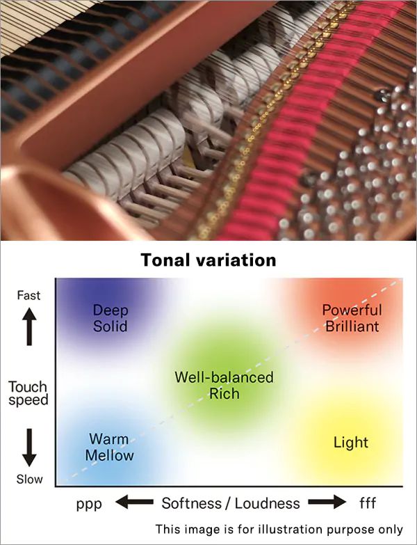 Моделирование Grand Expression Взаимодействие и работа молоточков, демпферов и струн внутри концертного рояля откликаются на самые тонкие нюансы прикосновений пианиста, создавая неограниченное разнообразие тембрового выражения. Прикосновение к клавишам — это не только контроль силы (от нежного до мощного) при нажатии и отпускании, но и скорость и глубина этих движений. Технология Grand Expression Modeling, впервые представленная в серии CLP-800, преобразует богатство прикосновений пианиста в бесконечное количество тембровых оттенков концертного рояля. Это позволяет изменять звук за счёт варьирования глубины и скорости нажатия клавиш — даже при использовании техник, таких как трели или легато, либо при акцентировании мелодии поверх аккомпанемента. Grand Expression Modeling с поразительной точностью воспроизводит ожидаемый результат этих приёмов в известных произведениях. В «Clair de Lune» Дебюсси лёгкое прикосновение рождает робкий тембр, отчётливо выделяя мелодию. В «Un Sospiro» Листа арпеджио аккомпанемента подчёркивает мелодию, не заглушая её, а её выразительность приобретает «вокальное» качество. В последней из ноктюрн Шопена, в трелях, легато и других тонких техниках, когда кажется, что пальцы просто парят над клавишами, достигается воздушная и текучая тембровая выразительность. Исполнение подобных произведений на чрезвычайно выразительном инструменте позволяет пианисту исследовать различные техники и испытывать ту же радость самовыражения, что и артист, но посредством звука. |